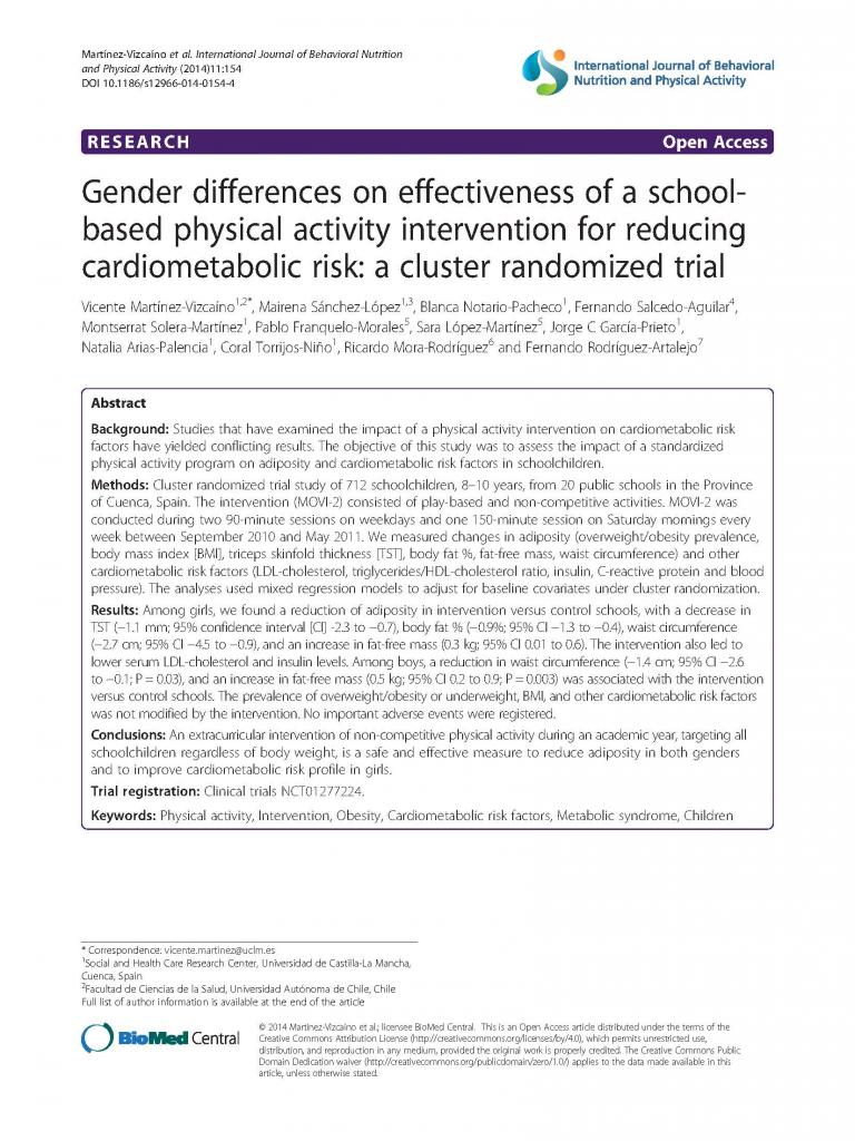 - Gender differences on effectiveness of a schoolbased physical activity intervention for reducing cardiometabolic risk: a cluster randomized trial