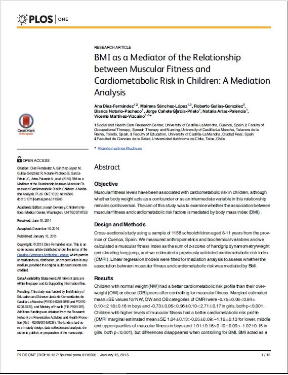 Abstract OBJECTIVE: Muscular fitness levels have been associated with cardiometabolic risk in children, although whether body weight acts as a confounder or as an intermediate variable in this relationship remains controversial. The aim of this study was to examine whether the association between muscular fitness and cardiometabolic risk factors is mediated by body mass index (BMI). DESIGN AND METHODS: Cross-sectional study using a sample of 1158 schoolchildren aged 8-11 years from the province of Cuenca, Spain. We measured anthropometrics and biochemical variables and we calculated a...