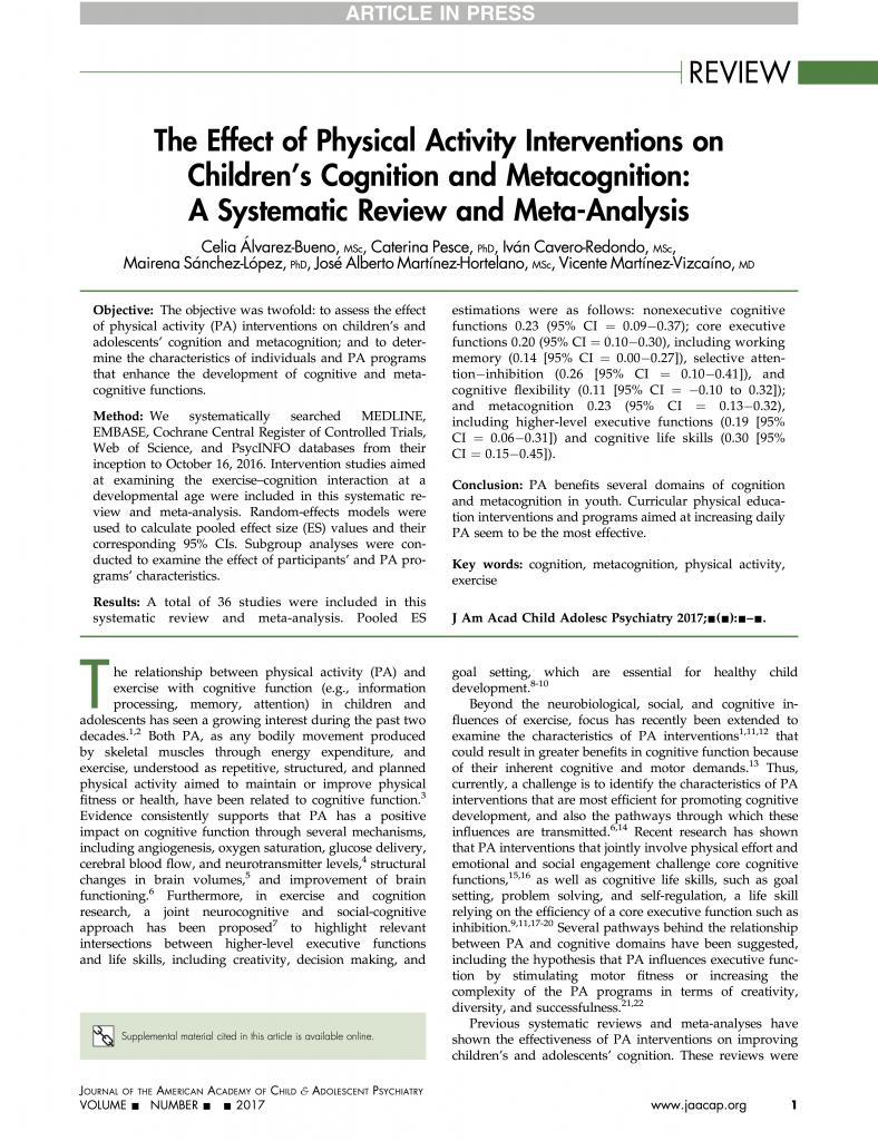 - The Effect of Physical Activity Interventions on Children’s Cognition and Metacognition: A Systematic Review and Meta-Analysis
